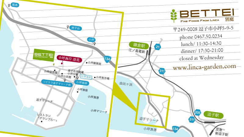 | 鎌倉駅から | 京急バス「鎌40(逗子駅行」乗車〜「小坪」下車 | |
